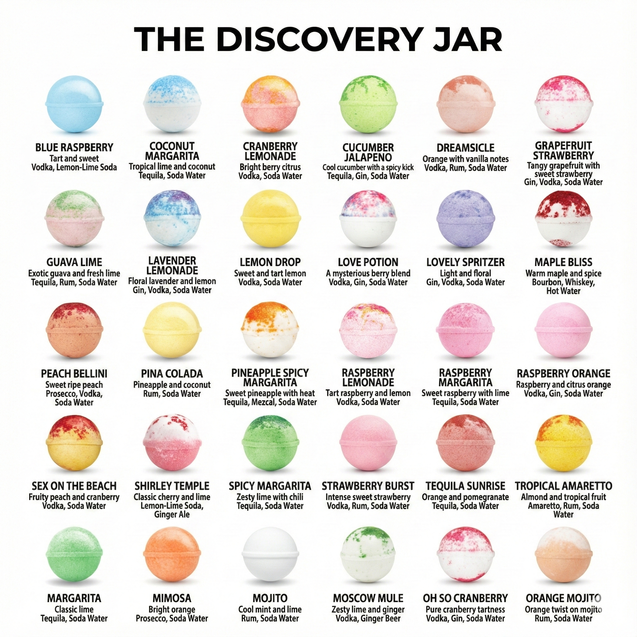 Discover the ultimate tasting adventure with our best-selling Cocktail Discovery Jar™, a one-of-a-kind collection featuring 30 unique, handcrafted cocktail bomb flavours in a single, gift-ready jar.