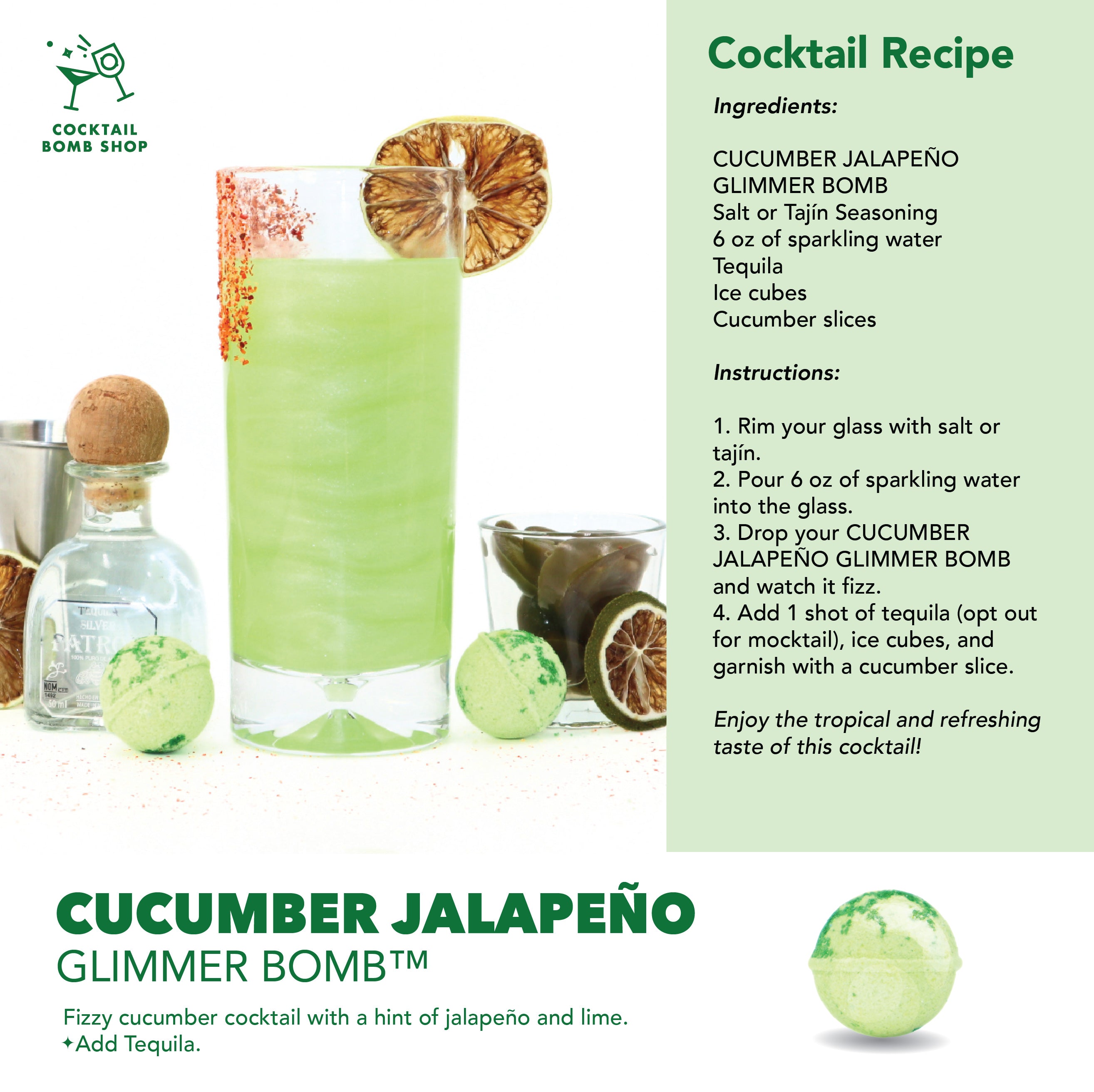 As each bomb fizzes in sparkling water, it creates a cooling, invigorating drink with subtle heat—ideal for spicy margarita fans, elevated hosting moments, or anyone who loves a fresh twist on classic flavours.