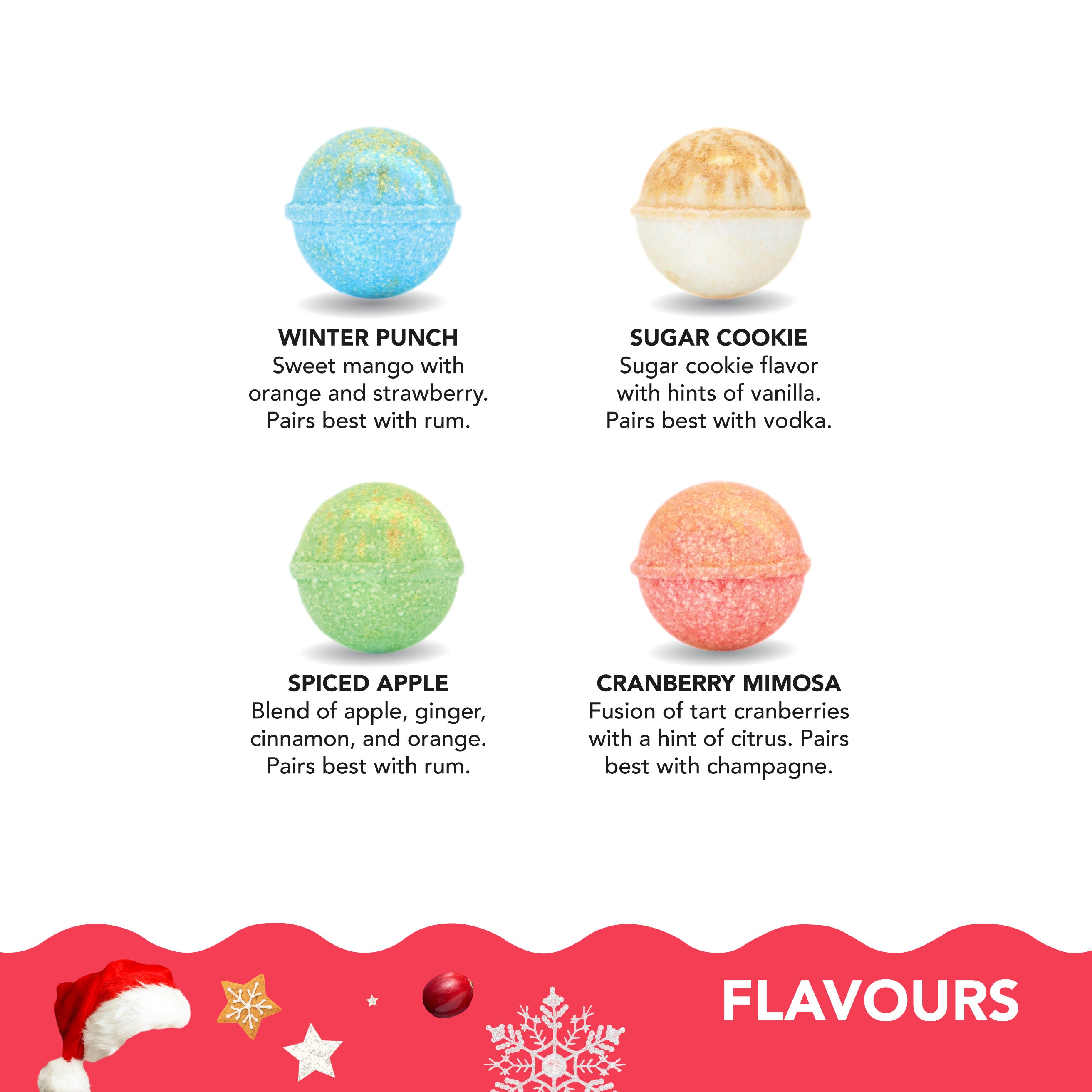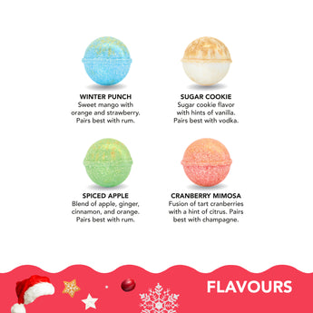 Introducing our new Santa's Favorites 4 Pack, a delightful collection of holiday-inspired cocktail bombs guaranteed to make your celebrations unforgettable.